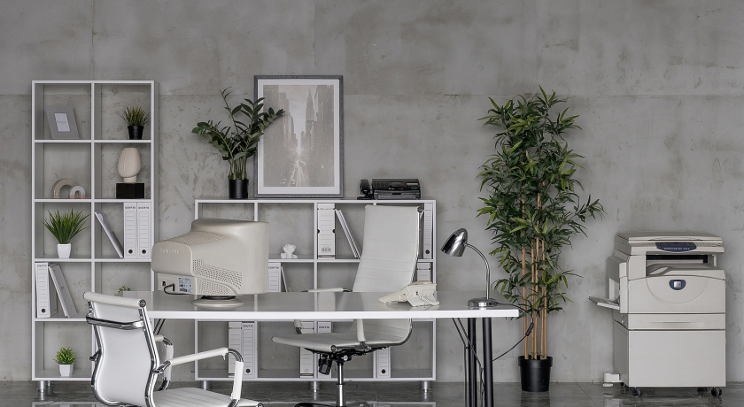 Просторный зал площадью 70кв.м. интерьер офиса. На окнах шторы блэкаут.