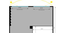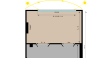 Два окна выходящие на солнечную сторону размером 4,5х3,5м. Прямые солнечные лучи попадают в зал с 12:00 и до заката.