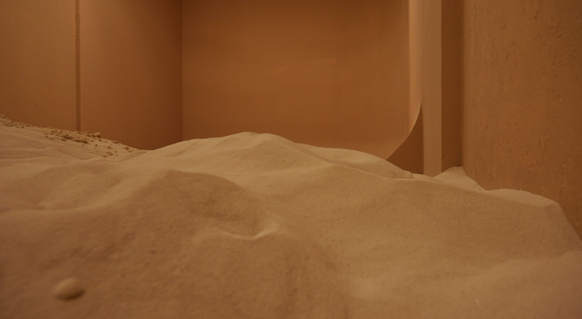 Просторный съемочный зал с настоящим морским песком. В песочной зоне множество фактурных сухих деревьев, большие камни прямиком с финского залива.