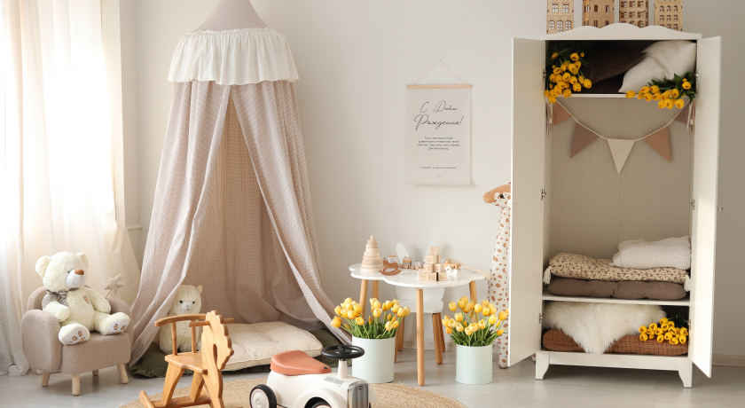 Диван, Живые цветы, Зеркало, Игрушки, Камин, Ковёр, Кресло, Кровать, Подушки, Стол, Стул, Шторы