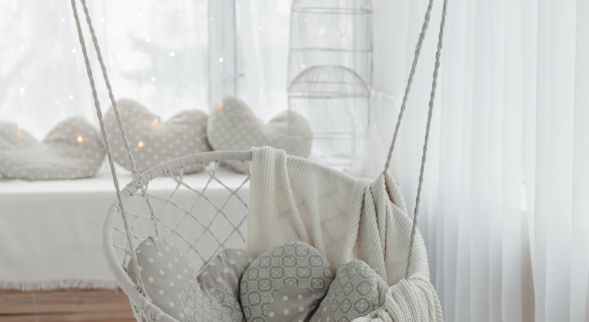 - зона балкона с подвесным плетёным креслом