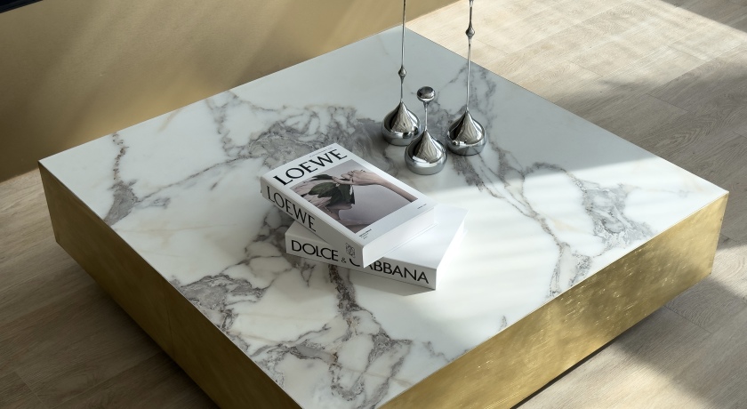 - Интерьерная зона с панно из натурального дуба — пышный низкий диван в стиле PACHA by Gubi, журнальный стол с мраморной фактурой, лаконичный торшер.