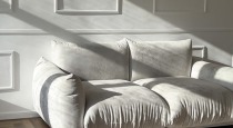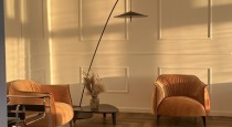 - Интерьерная зона с панно из натурального дуба — пышный низкий диван в стиле PACHA by Gubi, журнальный стол с мраморной фактурой, лаконичный торшер.