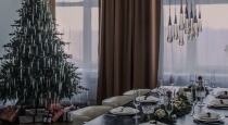 - Панорамные окна с легким тюлем и бархатными молочными шторами — мягкий естественный свет и возможность регулировать освещение.