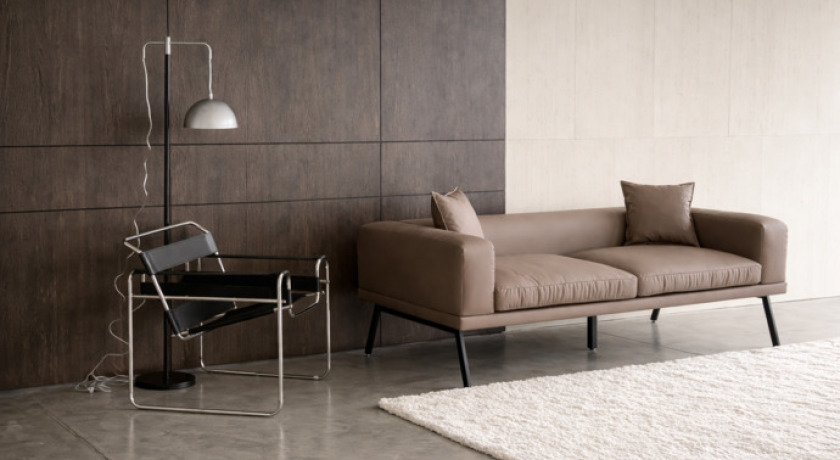 - Интерьерная зона с панно из натурального дуба — пышный низкий диван в стиле PACHA by Gubi, журнальный стол с мраморной фактурой, лаконичный торшер.