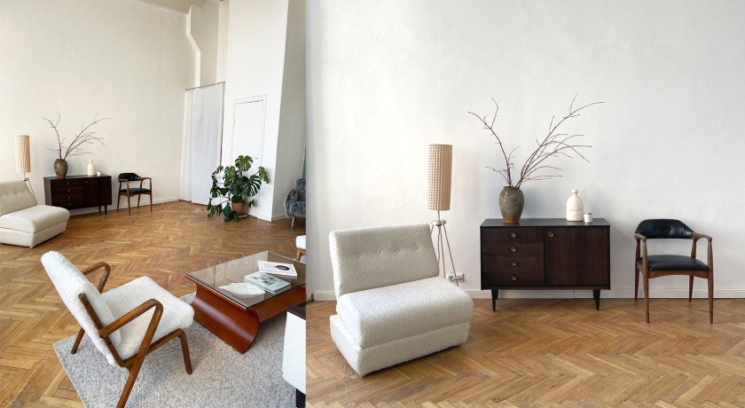 Зал 40 м2 с переменным декором. Большие окна, много света. Интерьерные зоны с винтажной мебелью и аксессуарами в стиле mid century modern и bauhaus. Кинопросмотры, семинары, дни рождения.