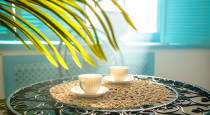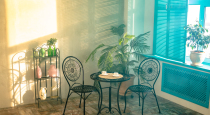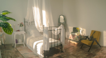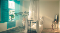 Зал «Мама Миа» — светлая фотостудия с винтажной кроватью в средиземноморском стиле и мягким естественным светом из больших окон с бирюзовыми ставнями. Это студия с естественным светом, где солнечные лучи создают красивый рисунок теней и идеально подходят для портретов, love story и утренних съёмок.