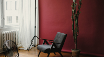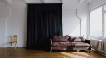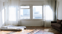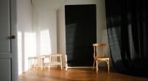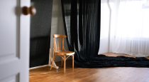 Сводчатый потолок, деревянный пол, белые стены, высокие 2,5 м распашные двери, льняные шторы и большие окна.