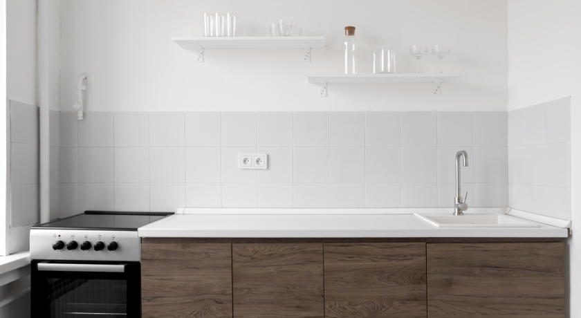 Кухня с совремнным кухонным гарнитуром, с деревянным столом и стулом, посудой.