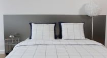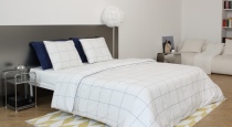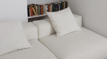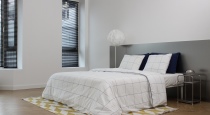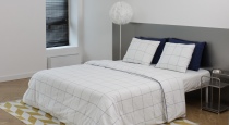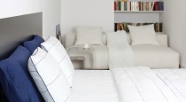 Спальня-гостиная — яркая комната с основым акцентом на желто-синий цвет, металл и дерево. В комнате 2 зоны: большая кровать с изголовьем из металла, белоснежный диван с библиотекой из книг. Также в этой комнате: металлический журнальный столик и прикроватная тумба, тумба цвета сливочного масла, торшер, зеркало в полный рост, картины и аксессуары.