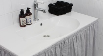 Уборная — белоснежная зона, с актуальной плиткой, винтажной дверью, а также раковиной с тканью.