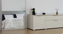 Спальня с балконом с белоснежной кроватью, креслом, тумбочками, зеркалом в полный рост, торшером.