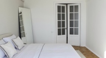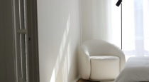 Спальня с балконом с белоснежной кроватью, тумбочкой, зеркалом в полный рост, торшером и креслом.