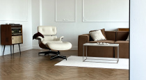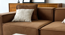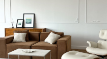 Стильное пространство в тёплой нейтральной гамме. Коричневый диван, белые акценты и простор создают уют. Отличный выбор для портретов, семейных и fashion-съёмок