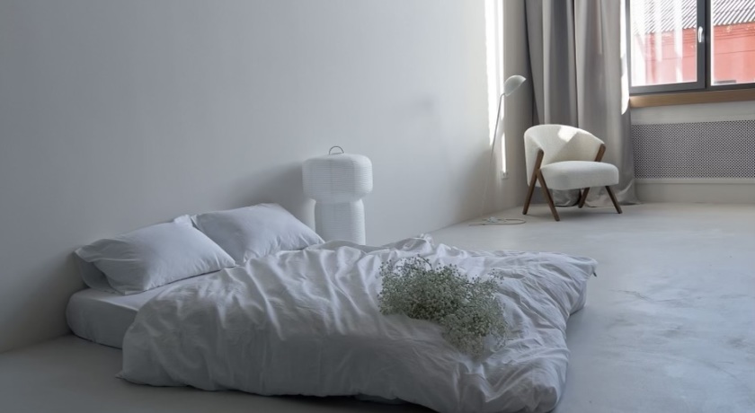 Минималистичное пространство со разными фонами - стеной из плитки, из черного кирпича, лестницей, ведущей к окну, образующее панорамное окно, стеной под бетон, тканевый фон из белой тафты.
