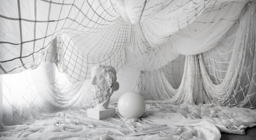 30 тонн белого песка, 400 кв. метров парашютной ткани, зал с 3х метровыми античными скульптурами, циклорама с верхним радиусом и теплым полом и винтаж.