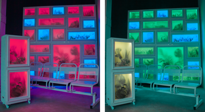 — огромный стеллаж с растениями и регулируемой цветной подсветкой