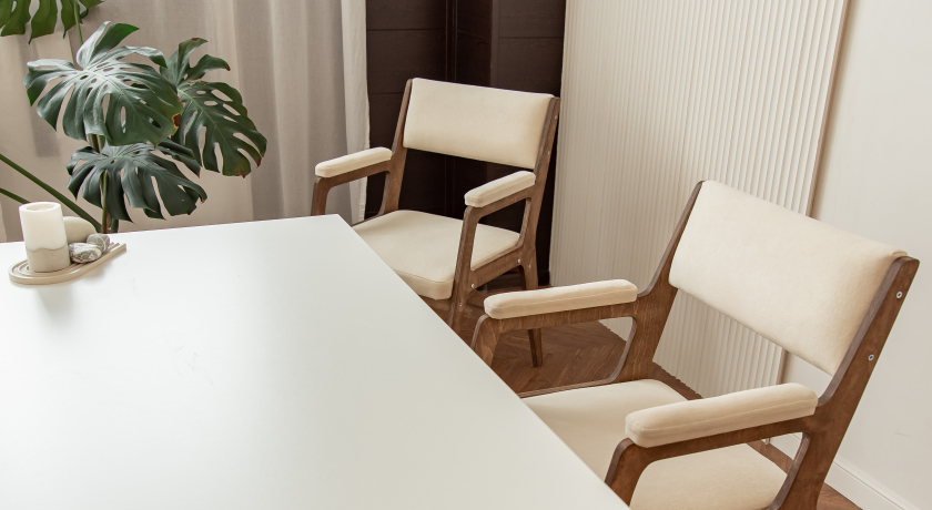 ✔️ 2 зоны в одном зале: интерьерная зона оформленная в нейтральных нюдовых оттенках (имитация квартиры) и фоновая полностью белая зона