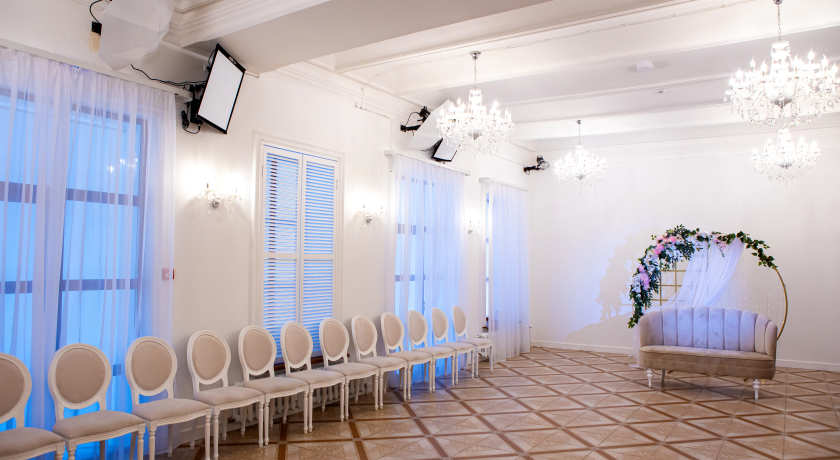 Зал находится на втором этаже: половина зала в классическом стиле, разделяется зал красивой мраморной лестницей. На второй половине зала локация Кухня, на которой можно сделать интересные снимки или разложить ваши закуски на банкет