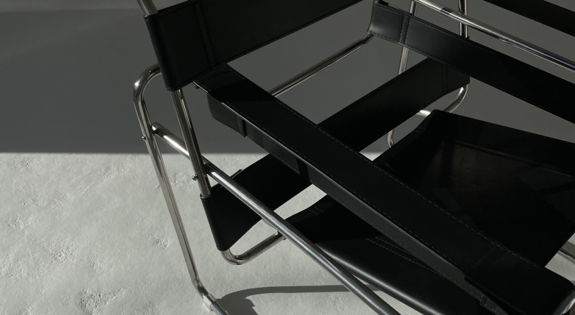 Современная модная мебель в стиле баухаус: белый Wassily chair, черное кожаное кресло, черный журнальный столик, белый пластиковый стул;