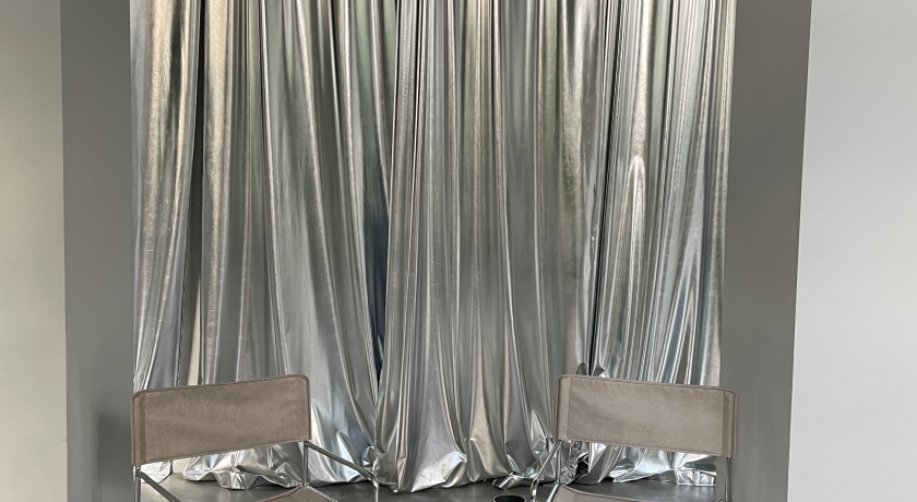 Бетонная арка, голографические и серебряные шторы, которые можно перемещать;