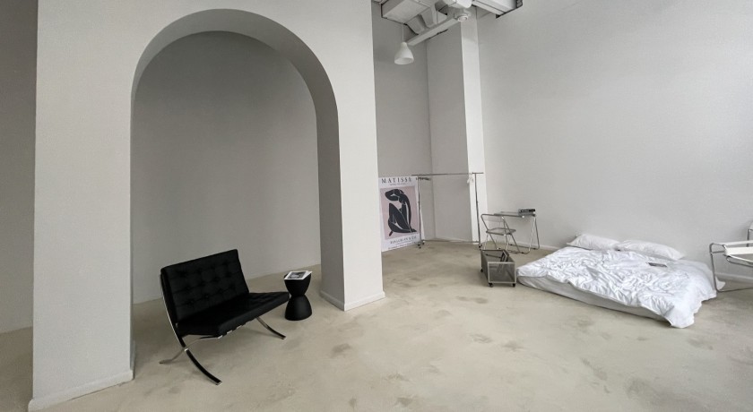 Локация с имитацией спальни: матрас с белым постельным бельем и небольшой рабочий столик, лампа-торшер с круглыми плафонами;