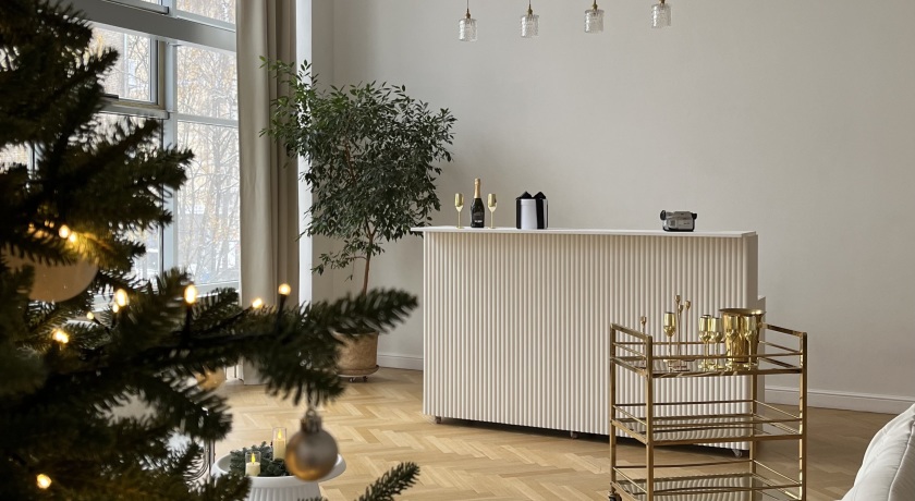 C 5 ноября по 11 нваря в зале находится новогодняя локации. При необходимости елку можно убрать из кадра, она на колесах, но ветки на камине не подлежит временному демонтажу.