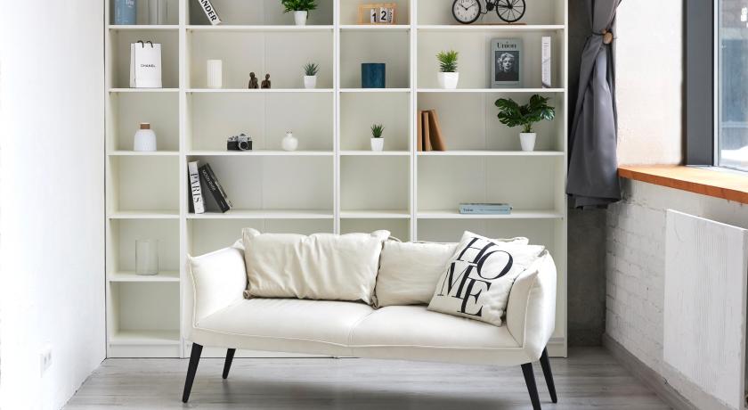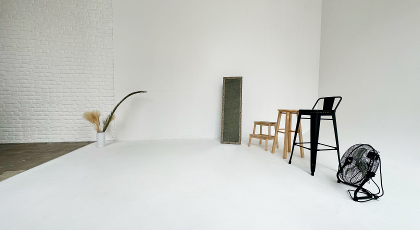 Пространство с панорамными окнами, лестницей, фактурной бетонной стеной, и стенами разных оттенков. В зале большое количество декора, диван, кресло, прожектор, и пр. Вся мебель легко передвигается и комбинируется в множество различных съемочных зон.