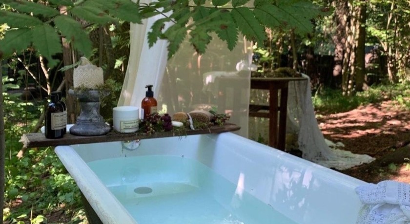 Находится на частной территории на фоне леса или поляны. Возможно перемещение к деревянному срубу.