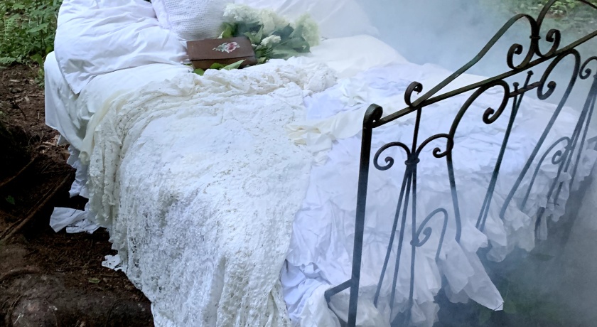 - белые старинные резные наличники подвешенные в лесу (6 штук в шахматном порядке)
