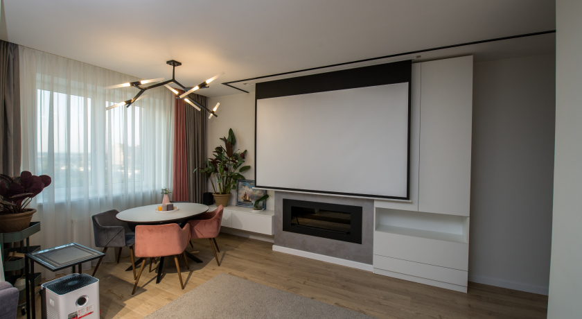 - просторная гостиная с камином, разнообразной мебелью и проектором,