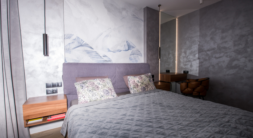 - уютная спальня с огромной кроватью;