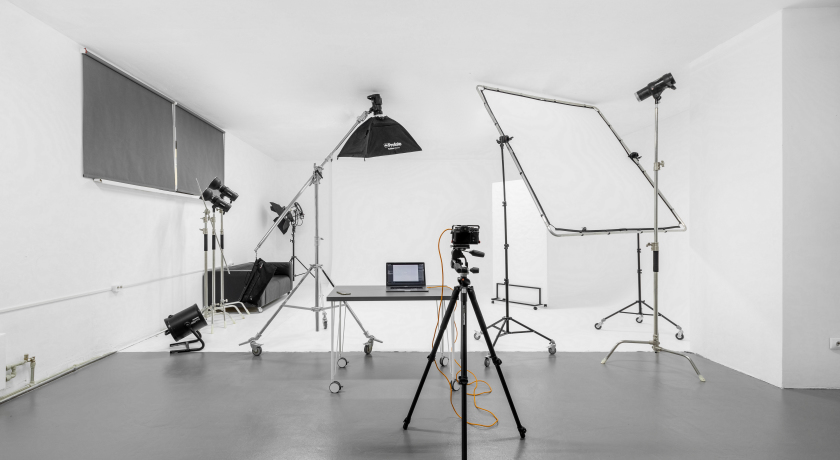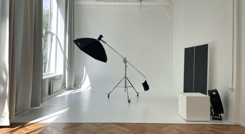 Просторный зал c циклорамой, белыми стенами, и большими окнами. Высота потолка 5 метров. В зале есть собственное гримерное место.