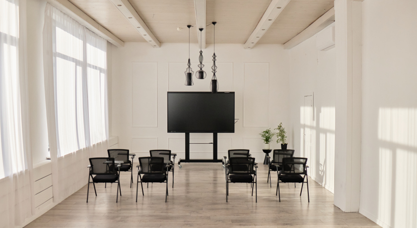 Пространство оборудовано удобными стульями, современным экраном и флипчартом, а также зоной для кофе-брейков с кулером и столом для угощений. Благодаря нейтральной цветовой палитре и функциональной планировке, зал легко адаптируется под любое мероприятие — от деловых встреч до творческих вечеров.