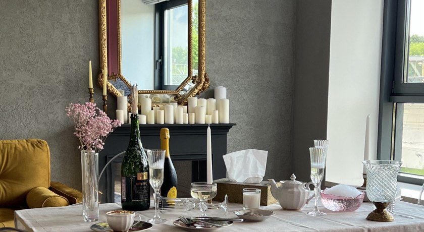 Акцентные стены зала VIVID являются отдельными локациями: розовая стена с ретро-комодом и круглыми светильниками, стена благородного серого цвета, декоративная бетонная стена, где стоит камин и висит винтажное зеркало в стиле барокко. Так же в VIVID стоит вельветовый диван яркого горчичного цвета, который в любой момент можно разложить и застелить двухспальную кровать.