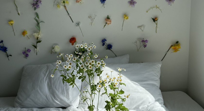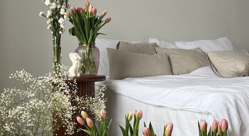 Просторная светлая спальня выполненная в минималистичном виде. Вся мебель мобильна, здесь находятся большая двухспальная кровать, зеркало в полный рост, а также множество съемного, передвижного и переставного декора. Одна из стен в спальне декорирована цветами, ее можно использовать как отдельную фотозону, так и в сочетании с кроватью. Также в спальне висит винтажная люстра.