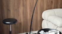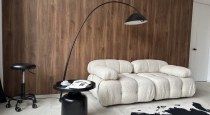 В зале находятся: диван с деревянными эллемантами, дизайнерское кресло, каменный столик , зеркало арка и самый фотогеничный торшер!