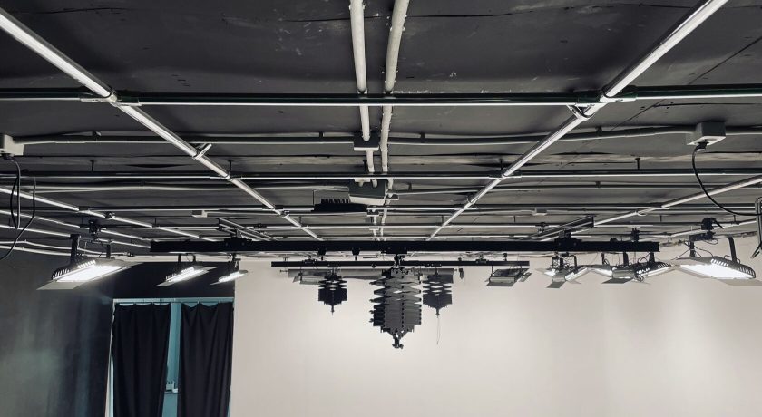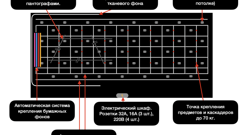 Потолочная подвисная система позволяет устанавливать оборудование в любой точке павильона, оснащена рельсовой системой с тремя пантографами и 48 потолочными розетками.