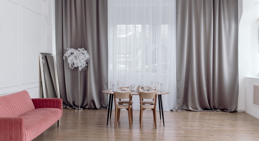 Зал разделён утонченной французской дверью на две зоны: столовая, гостиная