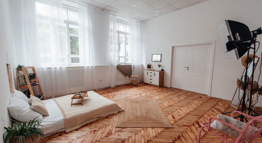 Пространство состоит из двух комнат. Основной зал с кроватью в стиле Бохо, стеллажом с ретро проигрывателем виниловых пластинок. Вторая комната состоит из детского уголка с вигвамом. Каждый зал оборудован импульсным светом Godox. Так же есть источник постоянного света с цветными фильтрами. Площадь зала 44 метров Вторая комната 14 метров Высота потолков 3,6 метра