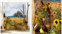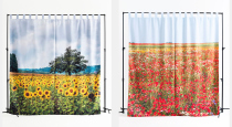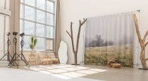 Зона с песком 3х2 метра, зона с камнями и растениями 4х2 метра. Более 40 тканевых и бумажных фонов, которые можно установить как в зоне с песком, так и в любой части зала. Угловая циклорама размером 9х6 метров. Удобное гримерное место.
