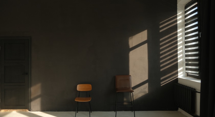 Контрастный зал с тёмными окнами, белыми и чёрными стенами, мебелью в классическом стиле