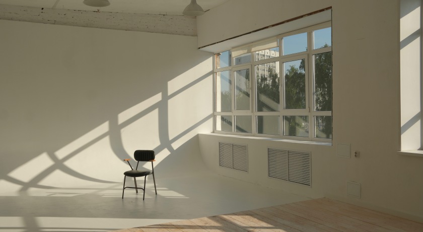 Окна зала выходят на солнечную сторону, солнце в студии на протяжении почти всего дня