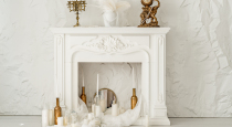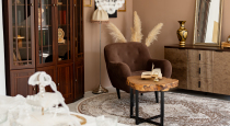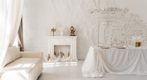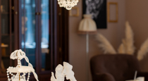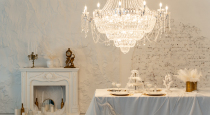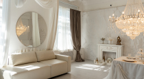 Основной зал представлен в современном классическом интерьере. В центре зала расположена роскошная огромная люстра, которая при желании может опускаться до пола, чтобы ваши кадры были более необычными и уникальными. Под люстрой находится большой стол с белой скатертью, который сервирован посудой и элементами декора. За ним располагается гипсовый камин со стеной, оформленной в виде скалы. Также в студии есть зона кабинета, оформленная в коричнево-золотых тонах с библиотекой, стильным комодом и брутальным креслом шоколадного цвета. В студии есть белый кожаный диван и огромное круглое зеркало.