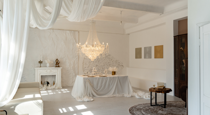 Основной зал представлен в современном классическом интерьере. В центре зала расположена роскошная огромная люстра, которая при желании может опускаться до пола, чтобы ваши кадры были более необычными и уникальными. Под люстрой находится большой стол с белой скатертью, который сервирован посудой и элементами декора. За ним располагается гипсовый камин со стеной, оформленной в виде скалы. Также в студии есть зона кабинета, оформленная в коричнево-золотых тонах с библиотекой, стильным комодом и брутальным креслом шоколадного цвета. В студии есть белый кожаный диван и огромное круглое зеркало.