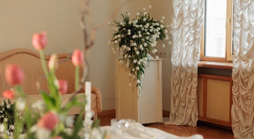 Декорации, Живые цветы, Картины, Люстра, Портьеры, Распашные двери, Свечи, Стол, Стул