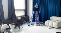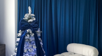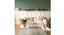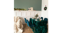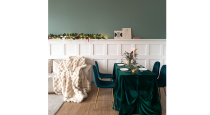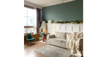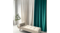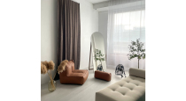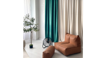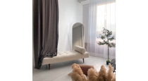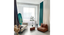 В зале мягкое кресло, диван-кушетка, бархатные ткани в молочного и изумрудном цвете. Панорамное окно, много дневного света.