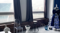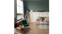Панорамные окна, коричневый паркет, светлые и фактурные стены.