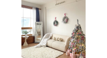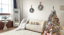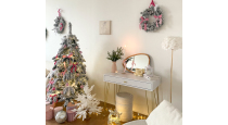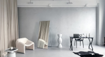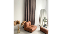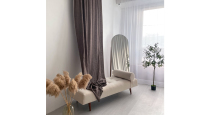 -кресло, столик, белые пуфы, декор, ростовое зеркало, ваза, вентилятор