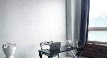 -стены с декоративной штукатуркой в серых тонах, пол- бетон